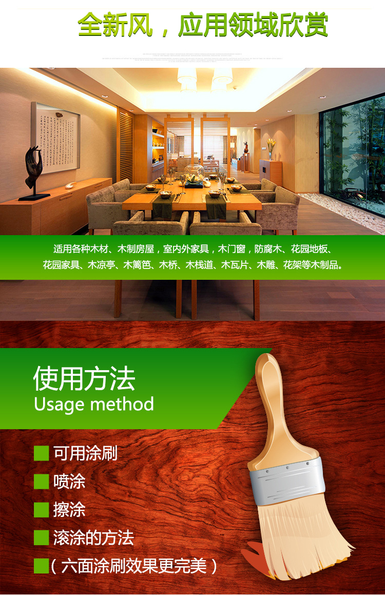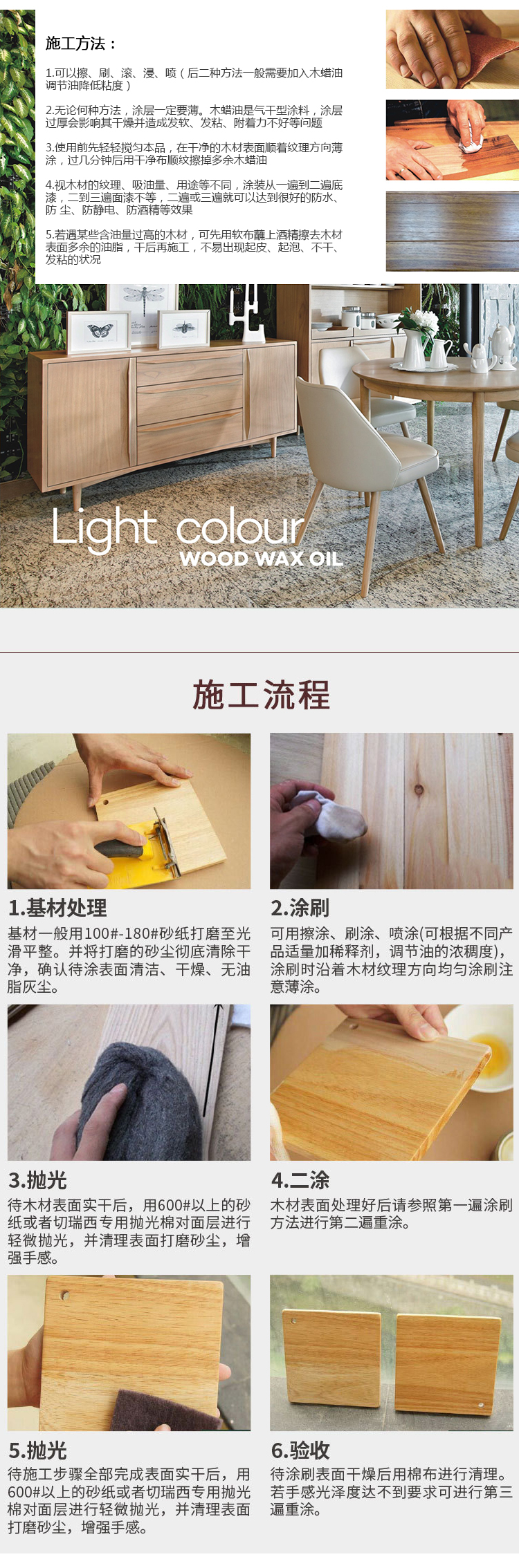 淺色不黃變木蠟油,給木材嬰兒般的呵護(hù),突顯紋理,盡顯木材本色,適用于室內(nèi)所有木器制品,可根據(jù)客戶需求與全新風(fēng)其他類型產(chǎn)品搭配使用,達(dá)到最理想的半開(kāi)放效果。