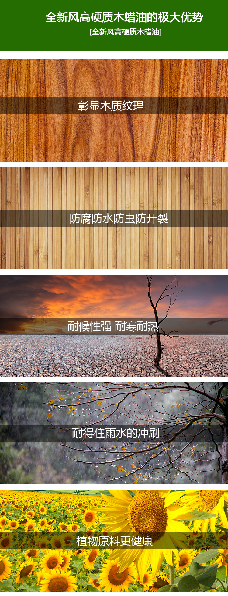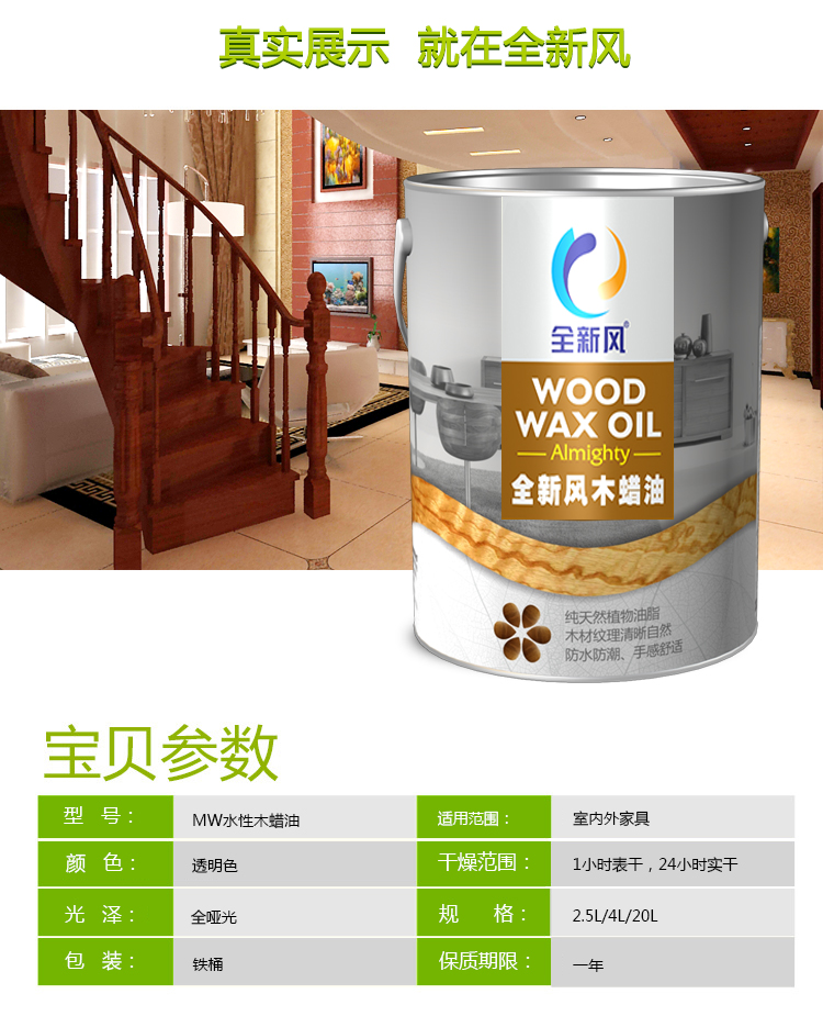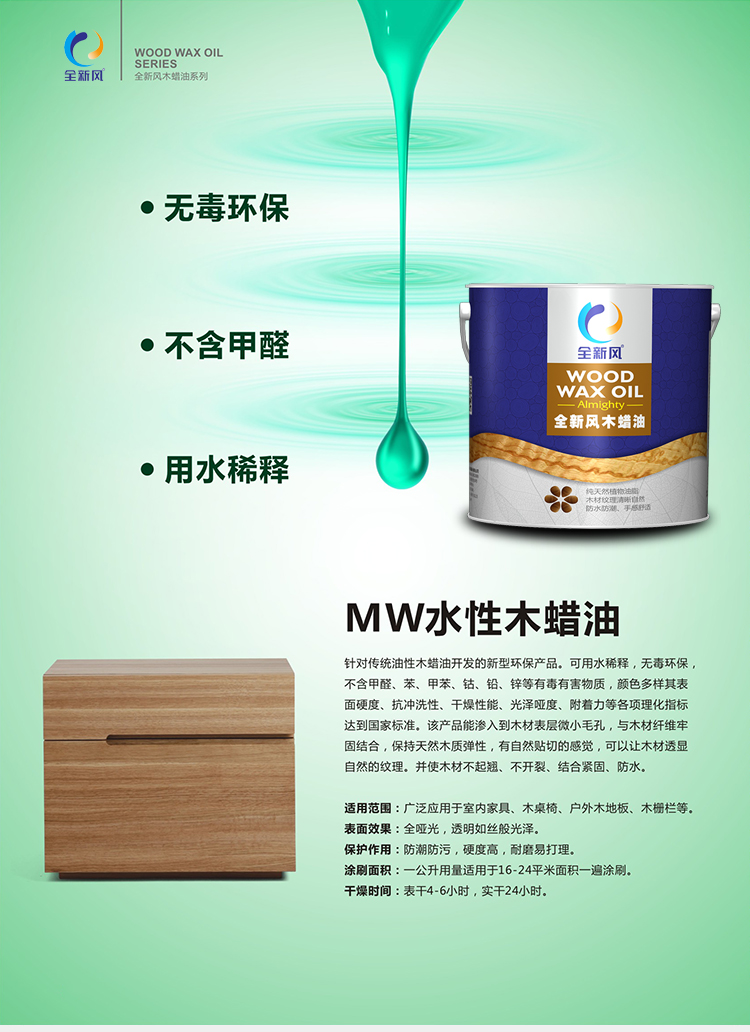 針對傳統(tǒng)油性木蠟油開發(fā)的新型環(huán)保產(chǎn)品。可用水稀釋,無毒環(huán)保,不含甲醛,苯,甲苯,鈷,鉛,鋅等有害物質(zhì),顏色多樣其表面硬度,抗沖洗性,干燥性能,光澤啞度,附著力等各項理化指標(biāo)達(dá)到國家標(biāo)準(zhǔn)。該產(chǎn)品能滲入到木材表層微小毛孔,與木材纖維牢固結(jié)合,保持天然木材不起翹,不開裂,結(jié)合緊固,防水。